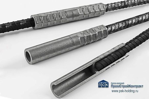 Переходная обжимная муфта PRESKO для соединения арматуры диаметром 40/36 мм. Разработанный ГК ПСК метод механического соединения арматуры (МСА) дает возможность соединять стержни не только одинаковой, но и разной толщины, начиная со стержней Ø 16 и 18 мм и заканчивая диаметром 36 и 40 мм, с использованием переходной обжимной муфты при помощи гидравлического оборудования PRESKO.